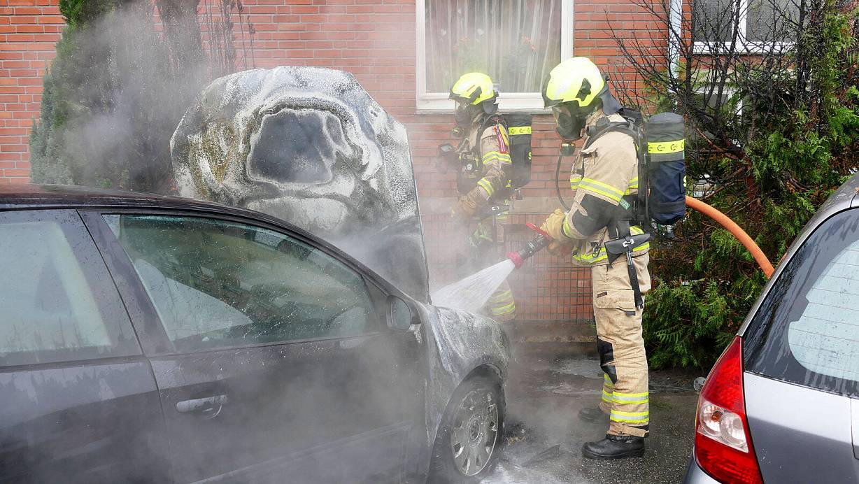 Der Motor des in der Rathenaustraße abgestellen VW Golf stand plötzlich in Flammen.