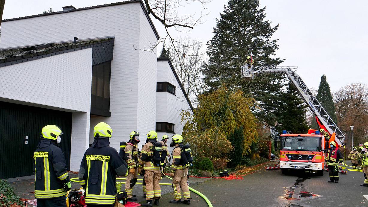 Rund 40 Kräfte der Paderborner Feuerwehr rückten zu einem Saunabrand im Keller eines Wohnhaus am Deipenweg aus. | © Ralph Meyer