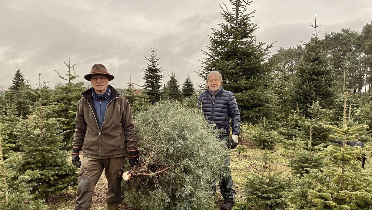 Heiner Vieth (l.) und Harry Surendorf mit einer Colorado-Tanne aus der eigenen Schonung. | © Phyllis Frieling
