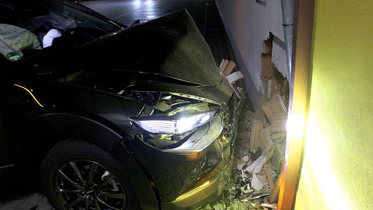 Ein Auto war frontal gegen die Wand neben dem Unterstand für die Einkaufswagen geprallt und hatte das Mauerwerk durchbrochen. Der schwarze Mazda CX30 stand schwer beschädigt mit ausgelösten Airbags und eingeschaltetem Licht am Unfallort. Eine Fahrerin oder einen Fahrer war nicht in Sicht.