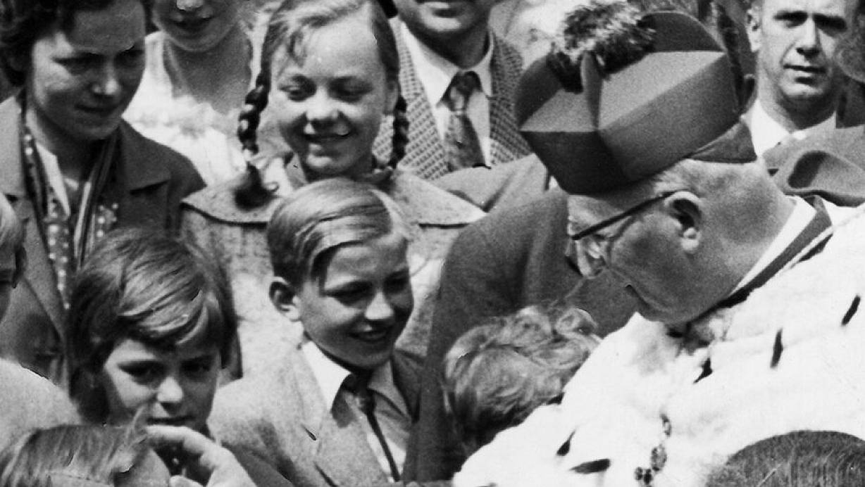 Auf diesem Foto aus der zweiten Hälfte der 1960er Jahre zeigt sich Erzbischof Lorenz Jaeger im Kardinalsrang nach einer Libori-Eröffnungsfeier vor dem Dom Kindern zugewandt. | © Sammlung Stüken