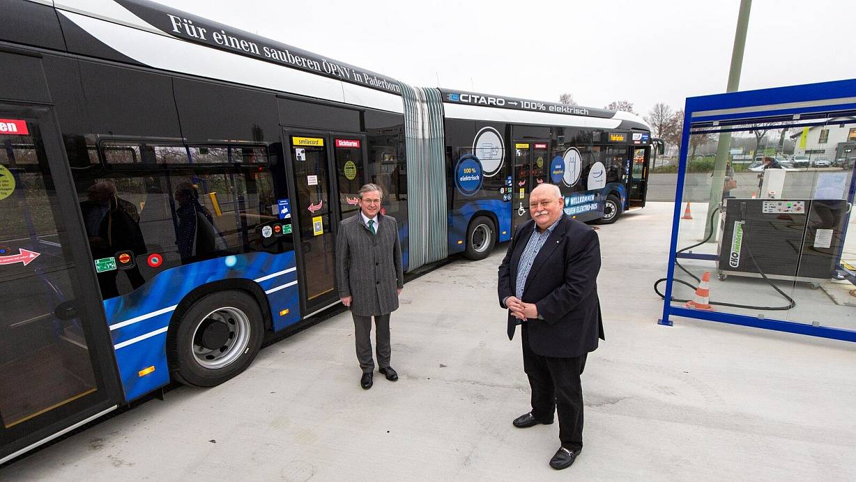 Bürgermeister Michael Dreier (l.) und Padersprinter-Geschäftsführer Peter Bronnenberg stehen vor dem neuen E-Bus, rechts ist die Auflade-Station zu sehen. | © Niklas Tüns