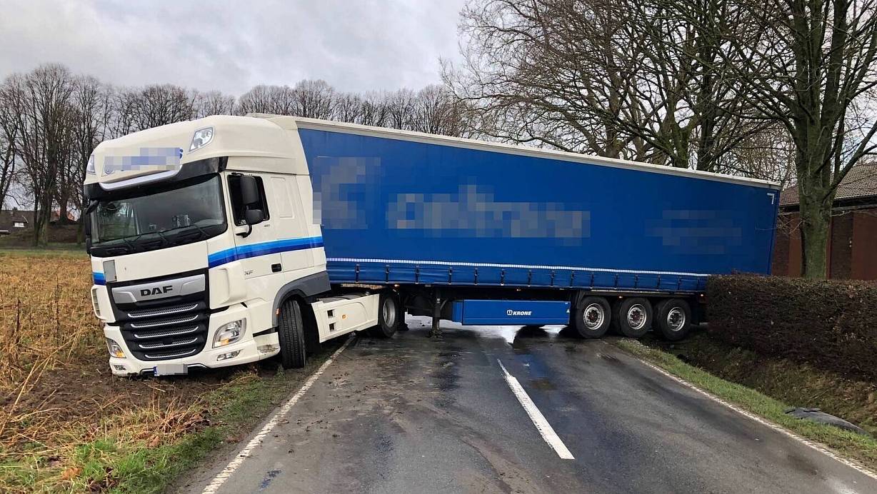 Der 48-jährige Fahrer eines polnischen Lastzuges, der Photovoltaik-Module geladen hatte, wollte demnach gegen 8.30 Uhr rückwärts in eine Hofeinfahrt setzen. Beim Rangieren fuhr sich die Zugmaschine auf einem Acker am Straßenrand fest. Auch die linken Räder des quer über die Fahrbahn stehenden Sattelaufliegers hingen neben der Zufahrt teils in der Luft über dem Straßengraben.
