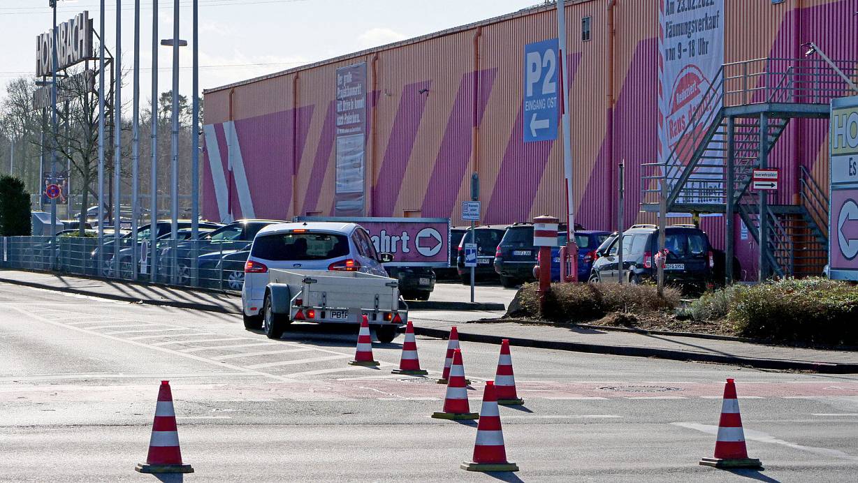 Der Weg zum Hornbach-Parkplatz wird mit Pylonen abgesteckt. | © Ralph Meyer