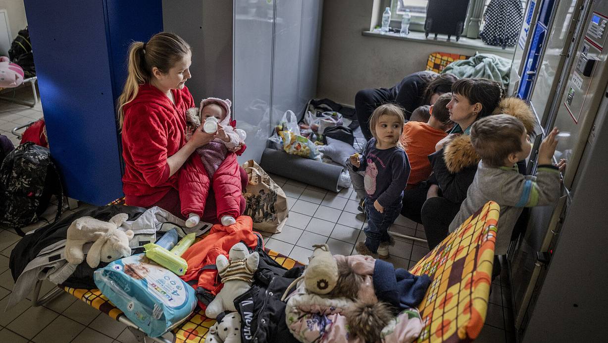 Maria Potoschaniak mit Baby Alina (l.) hat nach ihrer Flucht aus der Ukraine am Bahnhof von Przemysl ihr Lager aufgeschlagen. | © Michael Kappeler/picture alliance/dpa