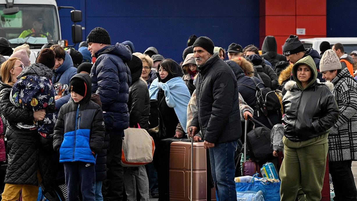 Flüchtlinge warten mit ihrem Gepäck an einer Erstunterkunft in Paderborns polnischer Partnerstadt Przemysl. | © AFP
