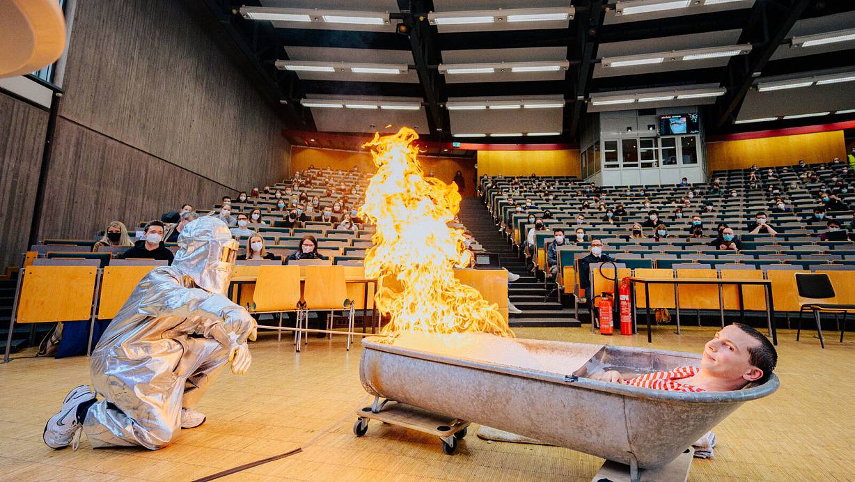 Die Event-Physiker der Uni Paderborn begrüßen die Erstsemster im Audimax unter anderem mit Badeschaum, der in Flammen aufgeht, weil er mit Methan gefüllt ist. | © Universität Paderborn/Besim Mazhiqi