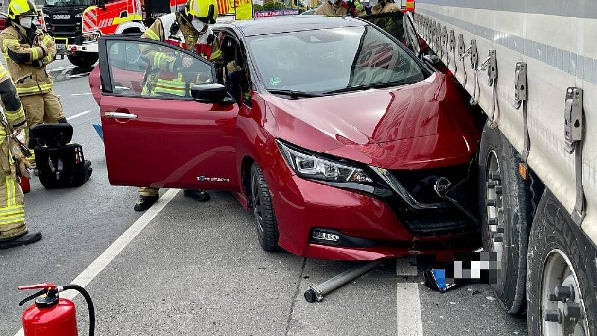 Elektroauto prallt beim Abbiegen in Paderborn auf stehenden Sattelzug