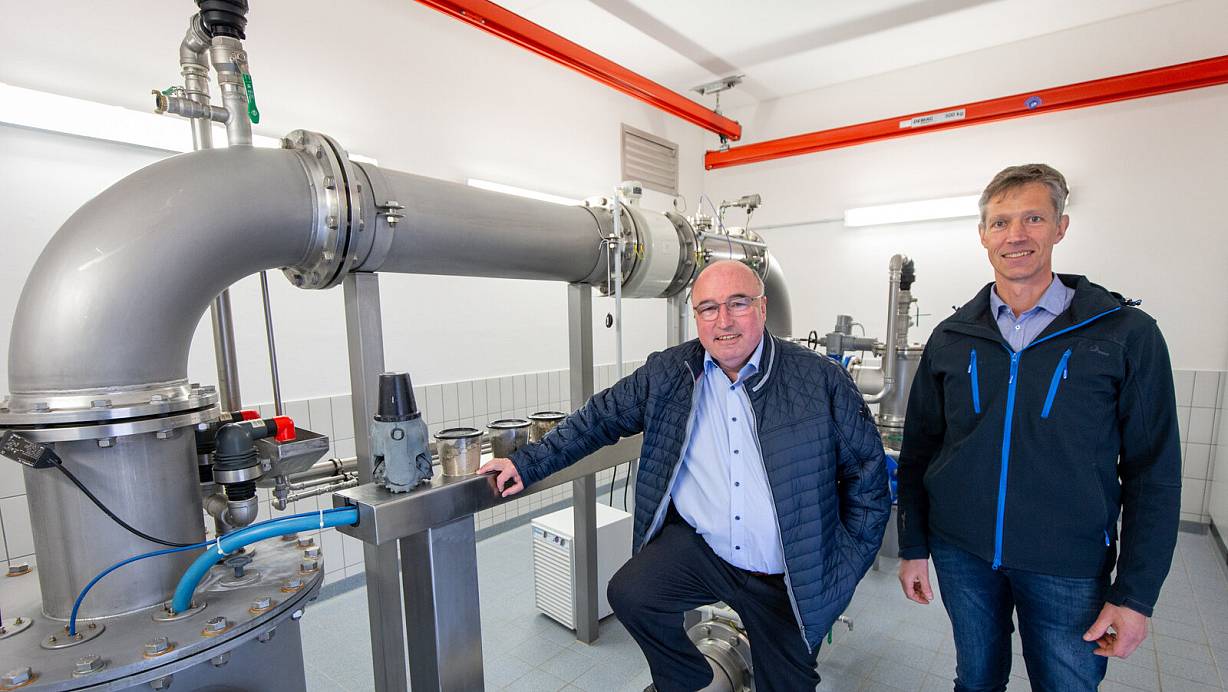 Michael Bernemann (l.) und Andreas Benstein stehen in einem Brunnengebäude der Wasserwerke. | © Niklas Tüns