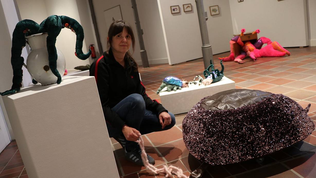 Julia Arztmann hält ihren Discokrebs an der Leine. Um sie herum wind weitere Textilarbeiten - wie die Nachttischkrabbe hinten rechts. | © Holger Kosbab