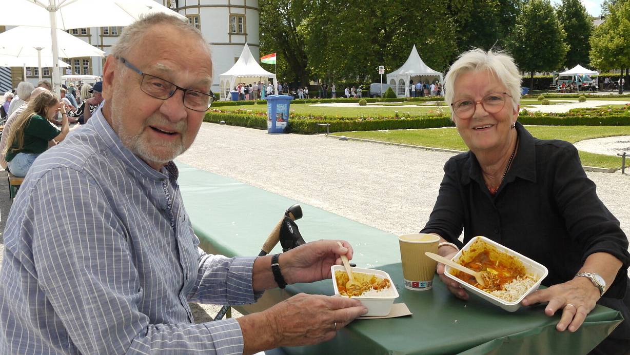 Karl-Heinz und Christa Börger aus dem Kreis Höxter lassen sich das Sabji an der langen Tafel der Begegnung schmecken. | © Lisa Richter