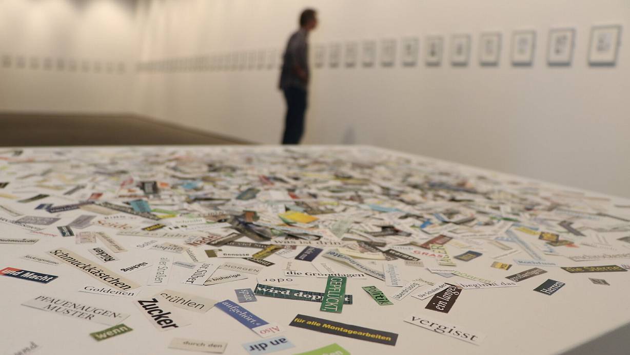 Herta Müllers Collagen bestehen aus einzelnen Wörtern, die sie aus unterschiedlichen Publikationen ausschneidet. Hier sind sie zur Veranschaulichung auf einem Tisch ausgelegt, wie ihn auch Müller zeitweise genutzt hat. | © Holger Kosbab