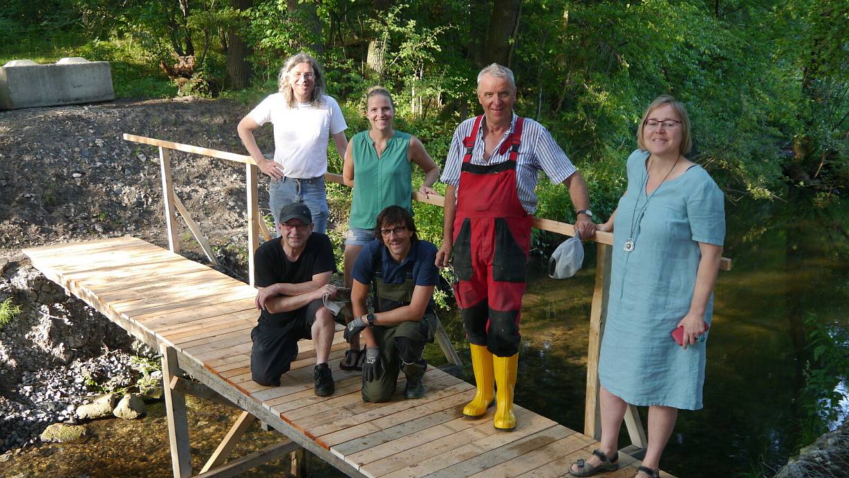 Windkraft-Unternehmer Johannes Lackmann (2. v. r.) ist aus Wut über den Abriss der Brücke gemeinsam mit Ehefrau Kerstin Haarmann und anderen Mastbruchern selbst tätig geworden. Der neue Holzübergang steht. | © Barbara Leiße