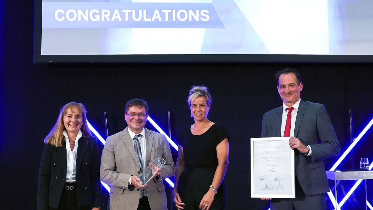 Wirtschafts- und Klimaschutzministerin Mona Neubaur und Felix Neugart, Geschäftsführer der landeseigenen Gesellschaft zur Außenwirtschaftsförderung NRW.Global Business, überreichten den Preis an Skyrora sowie an den US-amerikanischen Wasserstoff-Pionier Plug, den japanischen Technologie-Konzern Asahi Kasei und den Halbleiter-Produzenten Elmos Semiconductor aus Dortmund.