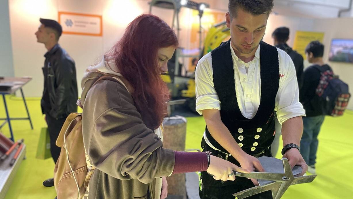 Auf der Connect Ausbildungsmesse zeigt Dachdecker Tobias Püttschneider, wie die traditionelle Handwerkstechnik funktioniert. Aus Schieferplatten können Interessierte verschiedene Motive erstellen. | © Janina Pietruschka