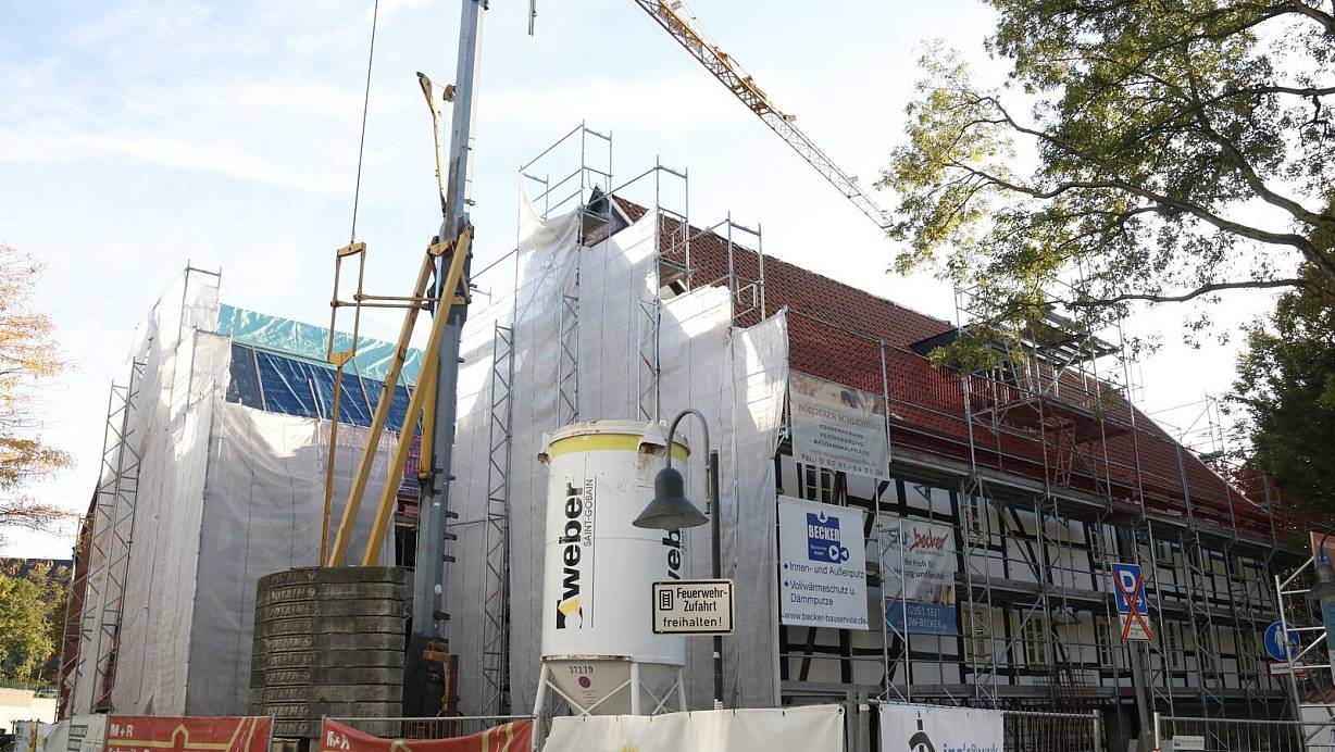 Hinter der Plane sind die Bauarbeiten am Adam-und-Eva-Haus sowie am benachbarten Haus Erzengel derzeit in vollem Gange. | © Sven Hauhart
