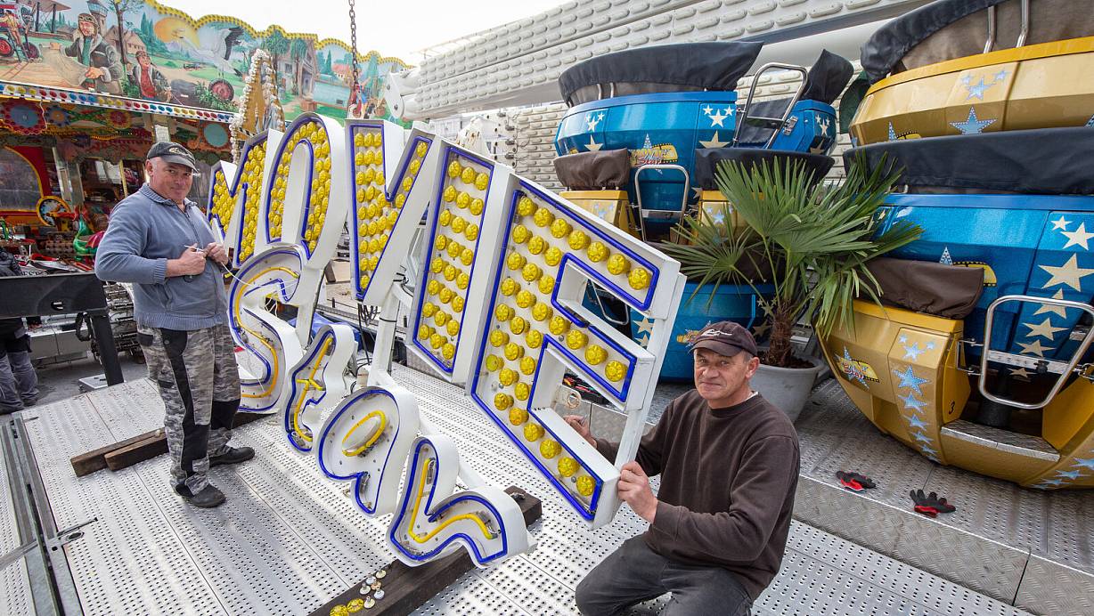 Die Mitarbeiter Slawomir Nisniewski (l.) und Sip Karol sorgen dafür, dass sich ab dem Wochenende das Riesenrad drehen kann. | © Niklas Tüns