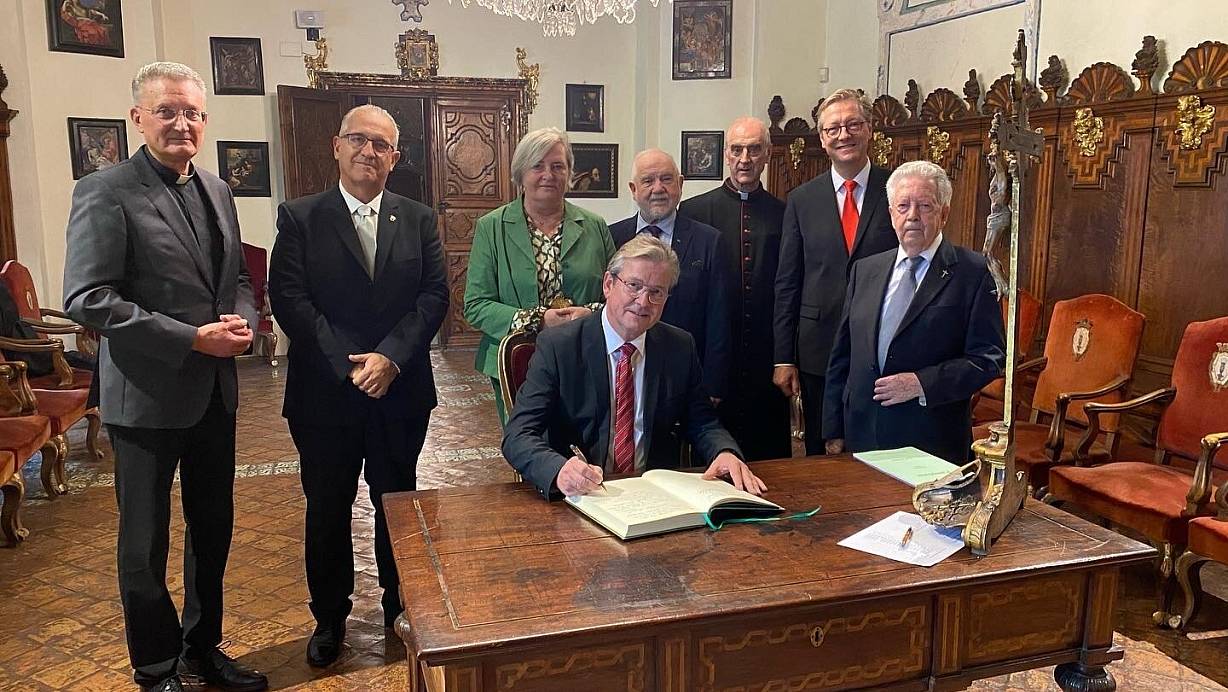 Paderborns Bürgermeister Michael Dreier trägt sich ins Goldene Buch der Kathedrale von Pamplona ein. | © Privat
