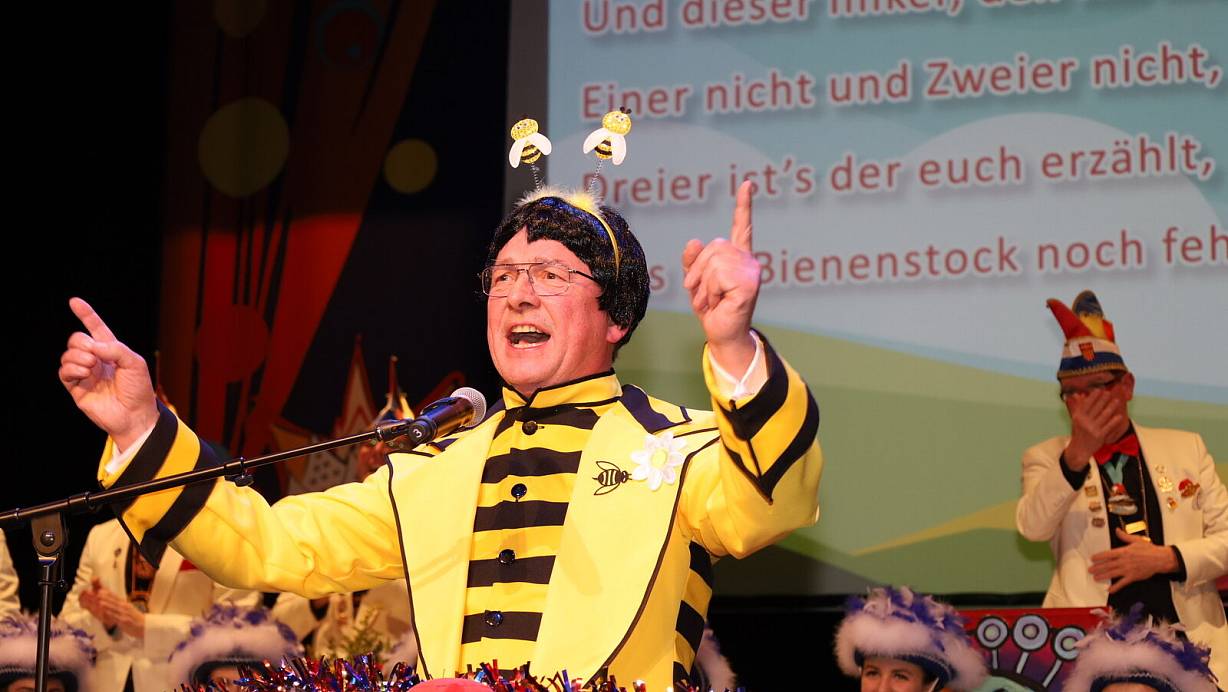 Bürgermeister Michael Dreier ist als quietschgelbe Biene Maja Star der Freitagssitzung. Nach der Verleihung mit dem Orden ohne Namen für einen guten Namen erntet der Hobbyimker mit einer gereimten Büttenrede und gekonnten Gesangseinlagen frenetischen Applaus. | © Regina Brucksch
