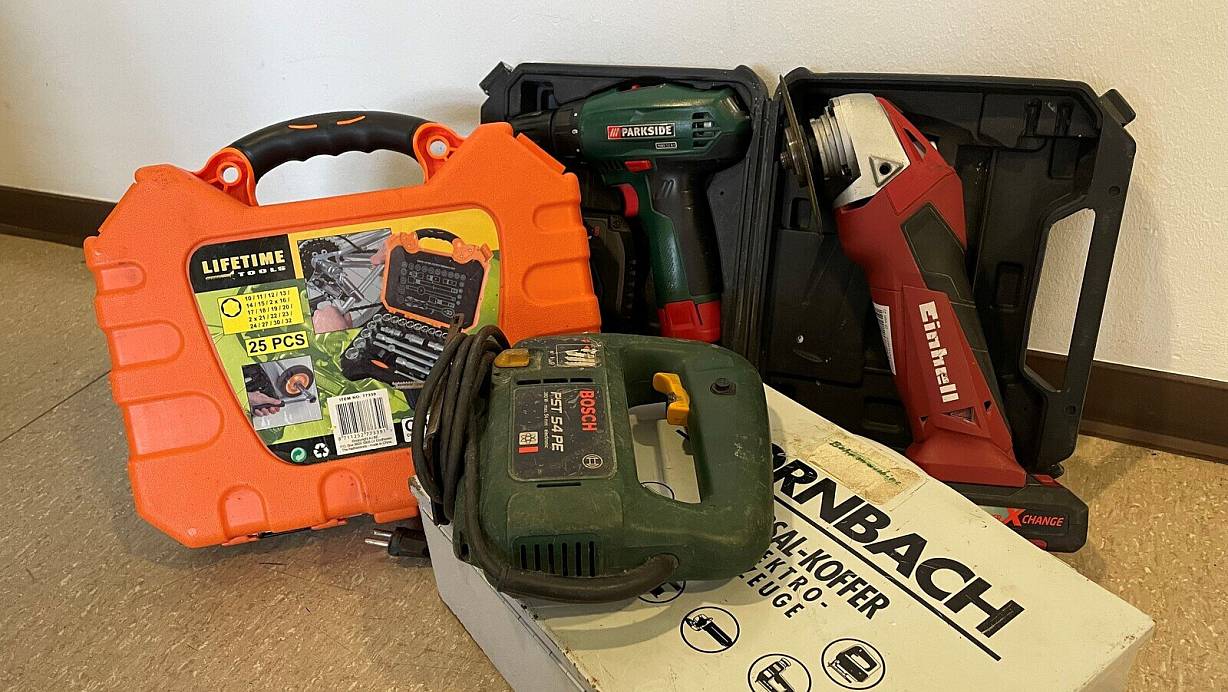 Einen Steckschlüsselkasten der Firma Lifetime, ein Akkuwinkelschleifer der forma Einhell, ein Akkuschrauber der Firma Parkside, eine Stichsäge der Firma Bosch, ein Universalwerkzeugkoffer der Marke Hornbach - handschriftlich etikettiert mit dem Wort "Bohrmaschine".