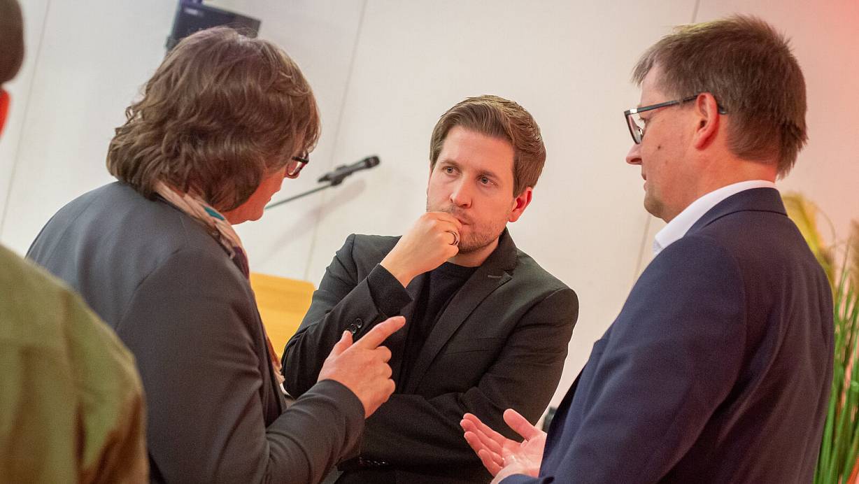 Kevin Kühnert (Mitte) im Gespräch mit der grünen Landtagsabgeordneten Norika Creuzmann und dem SPD-Kreisvorsitzenden Burkhard Blienert. | © Niklas Tüns