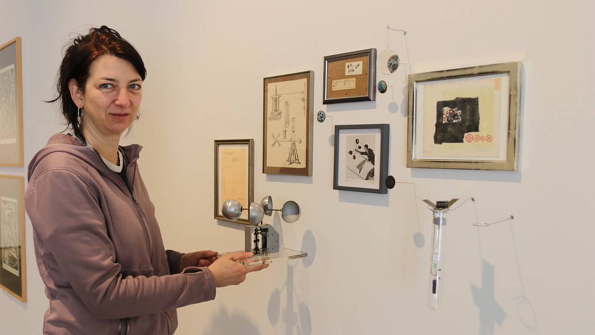 Tina Tonagel kombiniert in der Ausstellung "geheimnisvoll bewegt" kinetische Objekte zu Bildern der Künstler Robert Michel und Friedrich Meckseper. Hier entsteht eine Collage zum Thema Windmesser. | © Linda Schnepel