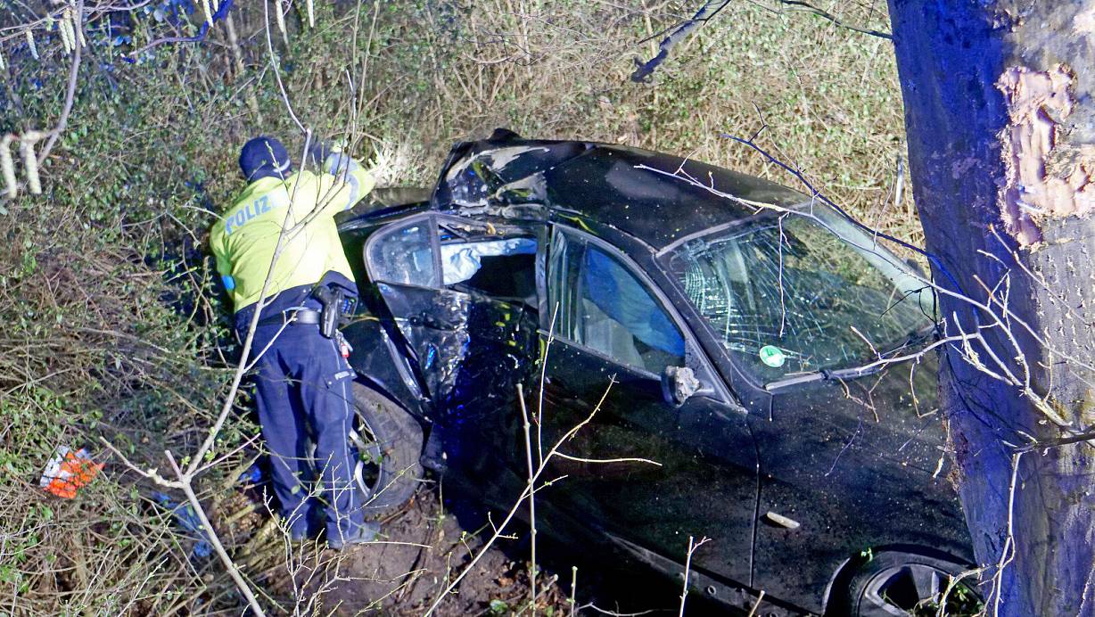 Ein schwerer Verkehrsunfall ereignet sich in der Nacht zu Montag. Der Wagen bleibt im Dickicht liegen. Feuerwehr und Polizei starten eine umfangreiche Personensuche.