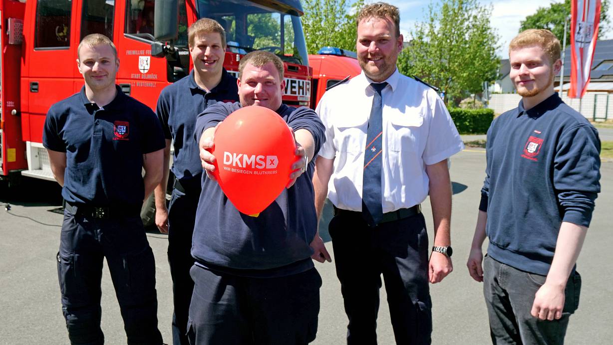 Marian Hamschmidt, Michael Bolte, Manuel Speit, Stefan Schormann-Diekmann und Björn Rübbelke unterstützten die DKMS-Aktion im Gerätehaus in Delbrück-Westenholz. | © Ralph Meyer