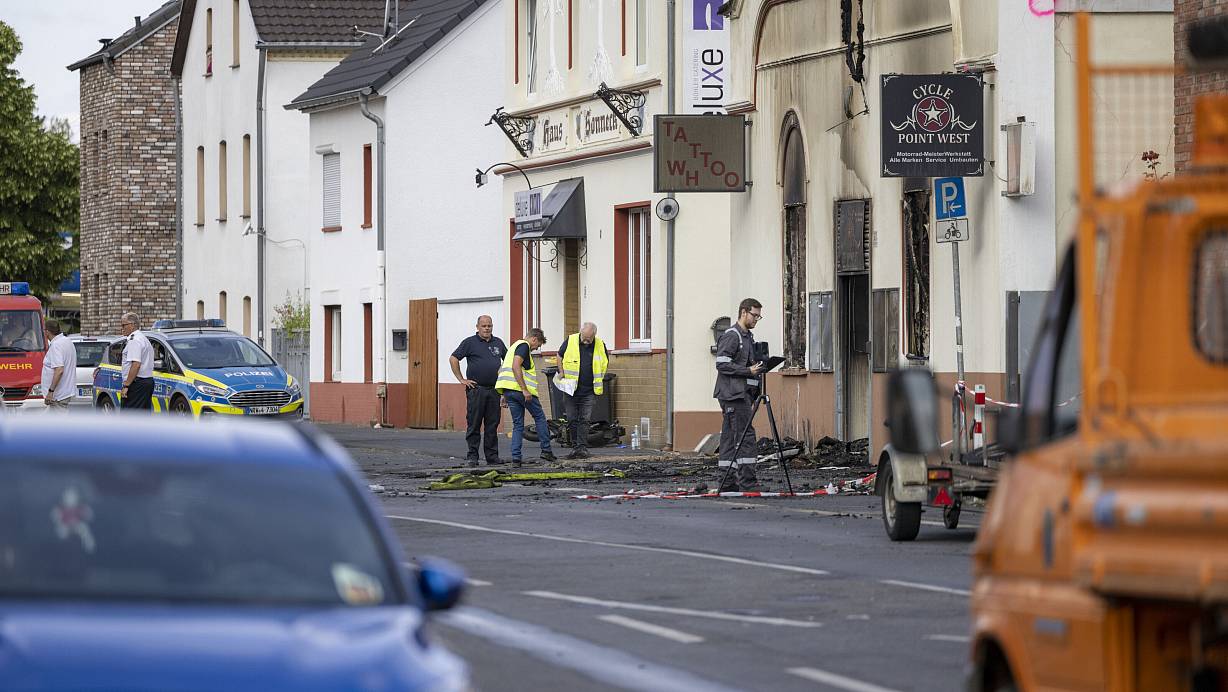 Blick durch das Absperrgitter auf das ausgebrannte Motorradgeschäft in Sankt Augustin. Nach dem Brand mit zwei toten Feuerwehrleuten laufen die Ermittlungen zur Brandursache. | © picture alliance/dpa