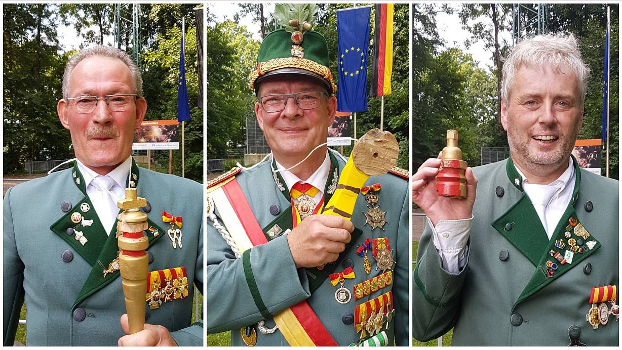 Gewannen Zepter, Apfel und Krone: Sergeant Klaus Eiden (Western, v. l.), Ehren-Fähnrich Carsten Masurek (Western) und Unteroffizier Gerald Kaufmann (Königsträßer). | © Birger Berbüsse