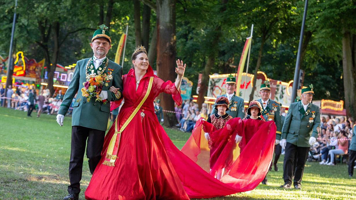 Lady in Red: Schützenkönigin Nicole Paul zieht bei der Parade am Abend mit ihrem Kleid aus roter Seide und der sechs Meter langen Schleppe alle Blicke auf sich. An ihrer Seite marschiert der stolze neue Regent des Paderborner Bürger-Schützenvereins, Bernfried Kaup. | © Niklas Tüns