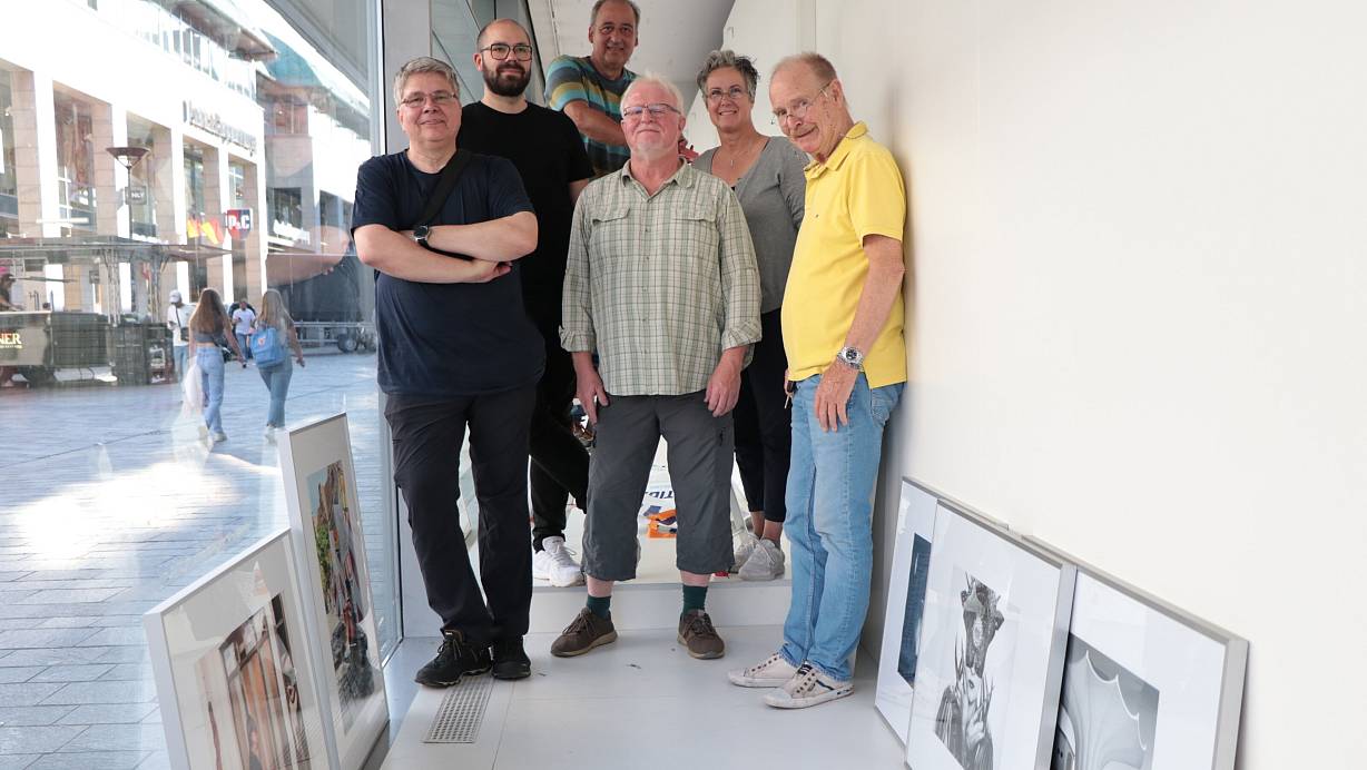 Axel Czypionka (v. l.), Tobias Vorwerk, Hagen Franke, Heinz-Dieter Voskamp, Monika Lumperda und Dave Lubek zeigen ihre Fotografien im Schaufenster der leerstehenden Kaufhof-Filiale in der Westernstraße. | © Holger Kosbab