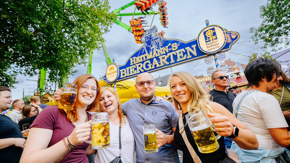 Isabell Fetters (v. l.), Giulia Krömer, Christian Kurte und Svenja Huber genießen das sommerliche Wetter und feiern den Start in die Festwoche. | © Besim Mazhiqi