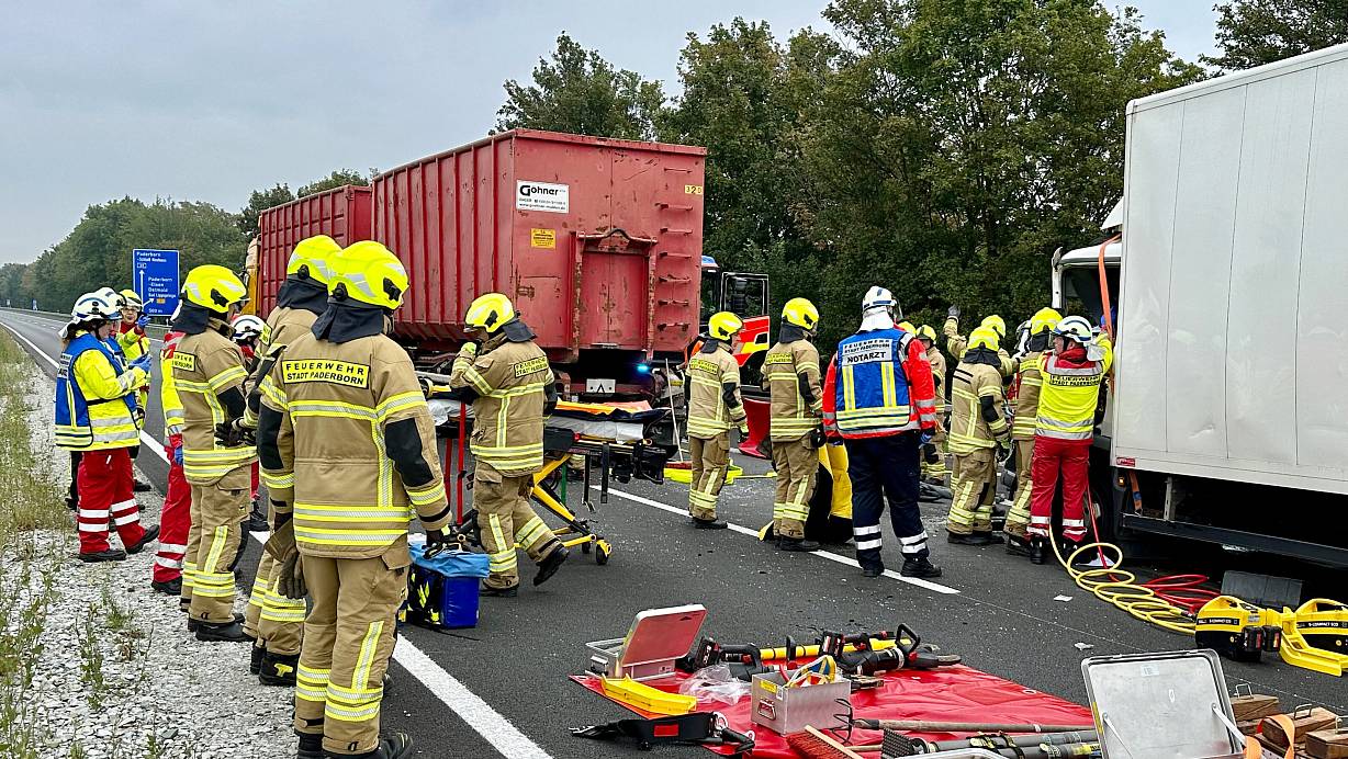 Ein 56-jähriger wird schwer verletzt und muss aus seiner Kabine befreit werden. Gegen kurz nach 11 Uhr konnte die Fahrbahn in Richtung Bielefeld wieder freigegeben werden.