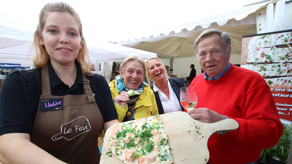 Hochstift à la carte in Paderborn hat wieder begonnen: Darüber freuen sich die Besucher (von rechts) Hans-Adolf Meise und Christina Kehne aus Bad Lippspringe und Gisela Rese aus Hövelhof sowie Nadine Peters, Inhaberin von Le Feu in Paderborn. | © Rajkumar Mukherjee