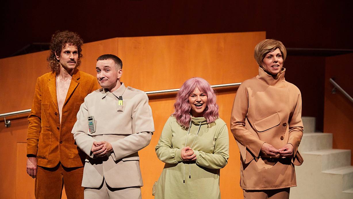 Gregor Weisgerber (v.l.) und Thomas Kaschel als Sachbearbeiter neben Mirjam Radovic als Maude und Kirsten Potthoff als Silke im Stück "Jeeps". | © Meinschäfer Fotografie