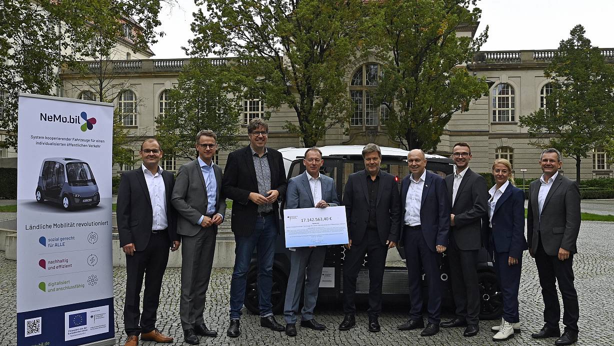 An der Übergabe der Fördermittelbescheide mit Bundeswirtschaftsminister Robert Habeck (Mitte) nahmen teil: (v.l.) Thorsten Marten (Universität), CDU-Bundestagsabgeordneter Carsten Linnemann, der Parlamentarische Staatssekretär Michael Kellner, Konsortialführer Marcus Zwick (Inyo Mobility), Landrat Christoph Rüther, Jonathan Behm (Neue Mobilität), Cristina Brandtstetter (Fiware Foundation) und Projektinitiator Thomas Tröster (Universität). | © BMWK/Andreas Mertens