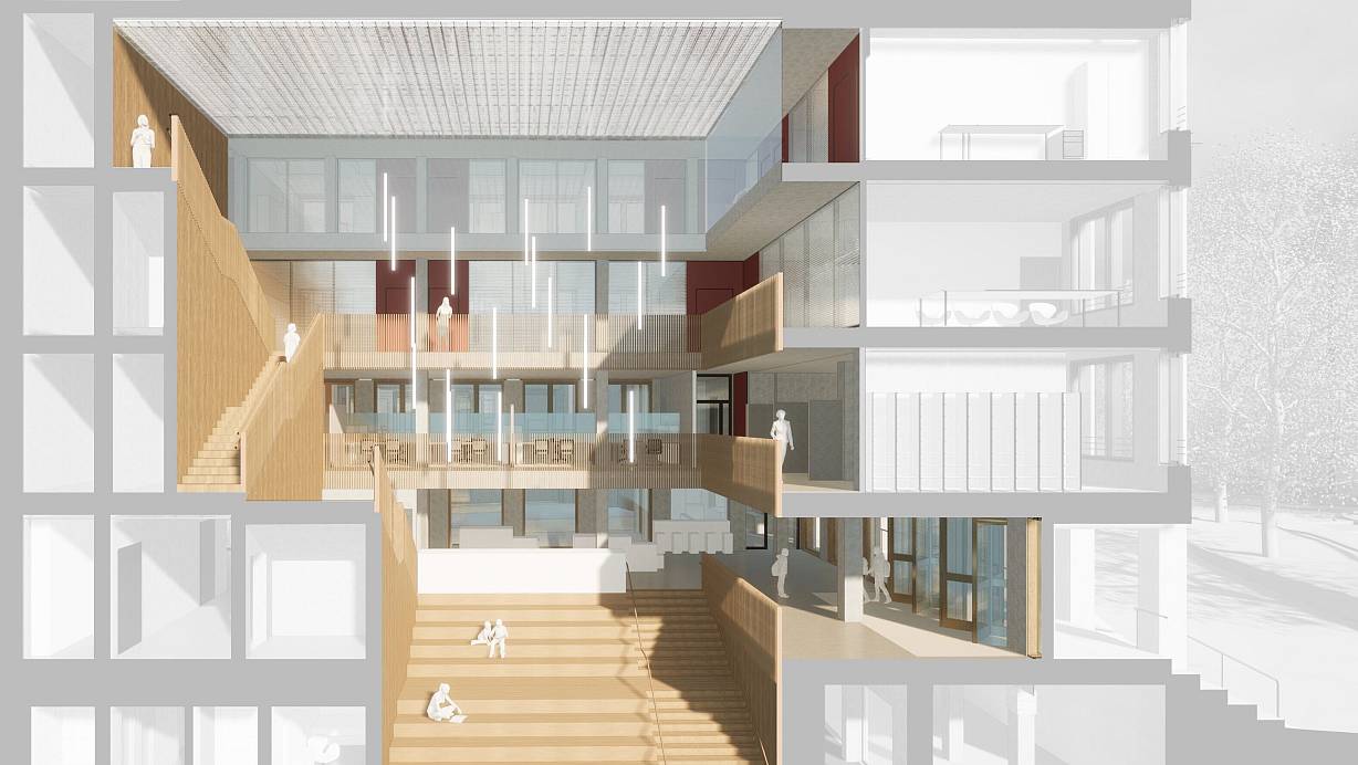 Diese Querschnittzeichnung durch das künftige Stadthaus zeigt die Treppe mit Sitzstufen, die die beiden Erdgeschossebenen verbindet. | © Behet Bondzio Lin
