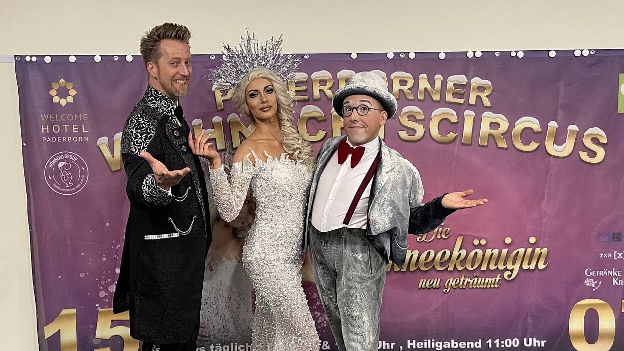 Zirkusdirektor Lars Wasserthal (v.l.), Artistin Sabrina Wasserthal und Komiker und Clown Monsieur Momo freuen sich auf ihre Gäste im Paderborner Weihnachtscircus. | © Dana Johanna Stoll