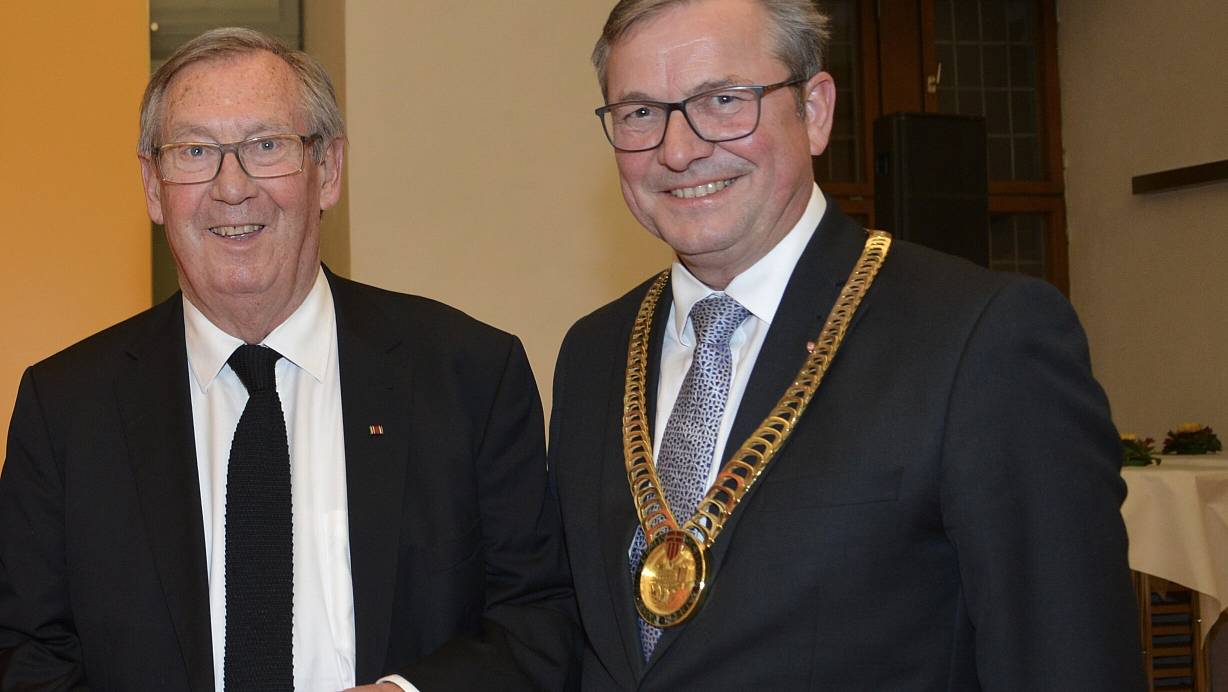 Als Brückenbauer der Freundschaft Paderborns zu Le Mans bezeichnete Michael Dreier Jean-Paul Couasnon. Am Mittwoch, 8. November, war Couasnon im Alter von 80 Jahren in der Paderborner Partnerstadt gestorben. Das Foto zeigt ihn (l.) mit Bürgermeister Dreier im November 2019 im Paderborner Rathaus bei der Verleihung der Kulturnadel der Stadt. | © Stadt Paderborn