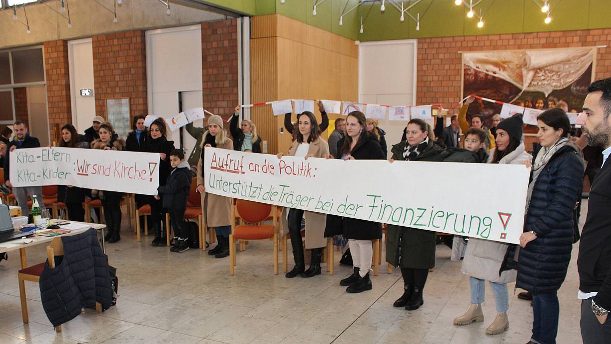 Während der Synode protestierten Eltern und Kinder der Paderborner Kita Himmelszelt gegen die drohende Aufgabe der evangelischen Trägerschaft und forderten auf Transparenten von der Politik mehr Unterstützung für die Träger. „Ich bin ganz bei Ihnen. Wir rufen die Politik auf, uns nicht im Regen stehen zu lassen“, sagte Superintendent Volker Neuhoff.