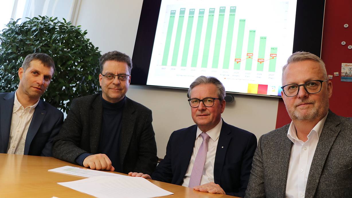Jörg Wiemers (Amt für Finanzen/Abteilungsleiter Haushalt/v. l.), Kämmerer Markus Tempelmann, Bürgermeister Michael Dreier und Thomas Mönikes (Leiter des Amtes für Finanzen) erläutern den Entwurf für den 2024er Haushalt. Im Hintergrund ist auf einer Grafik die deutliche Abnahme des städtischen Eigenkapitals in den kommenden Jahren zu sehen. | © Holger Kosbab