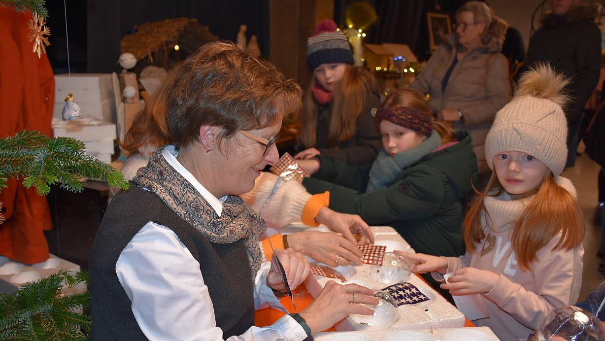 Das Weihnachtsbasteln mit Margret Rüther und Renate Herbst macht den kleinen Festgästen in der Kulturscheune großen Spaß. | © Brigitta Wieskotten