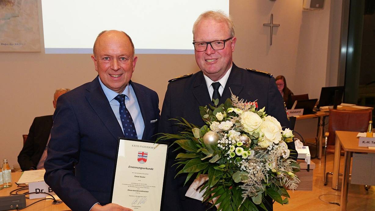 Paderborn. 15 Wehrführer, Weggefährten und Ehrenkreisbrandmeister Bernhard Lücke waren am Montagabend im Kreishaus zugegen, als Landrat Christoph Rüther den früheren Kreisbrandmeister Elmar Keuter nach einstimmigem Votum des Kreistages zum Ehrenkreisbrandmeister ernannte.