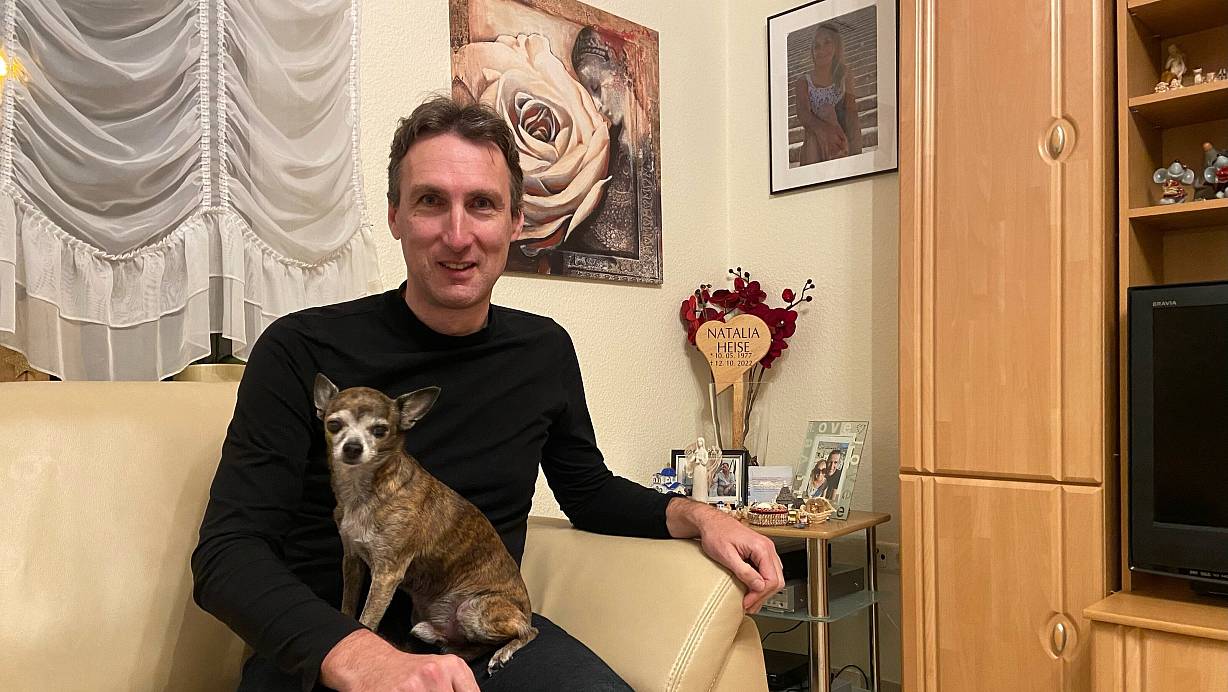 Lars Heise sitzt mit dem gemeinsamen Familienhund vor einem Gedenktisch für seine Frau. | © Dana Stoll