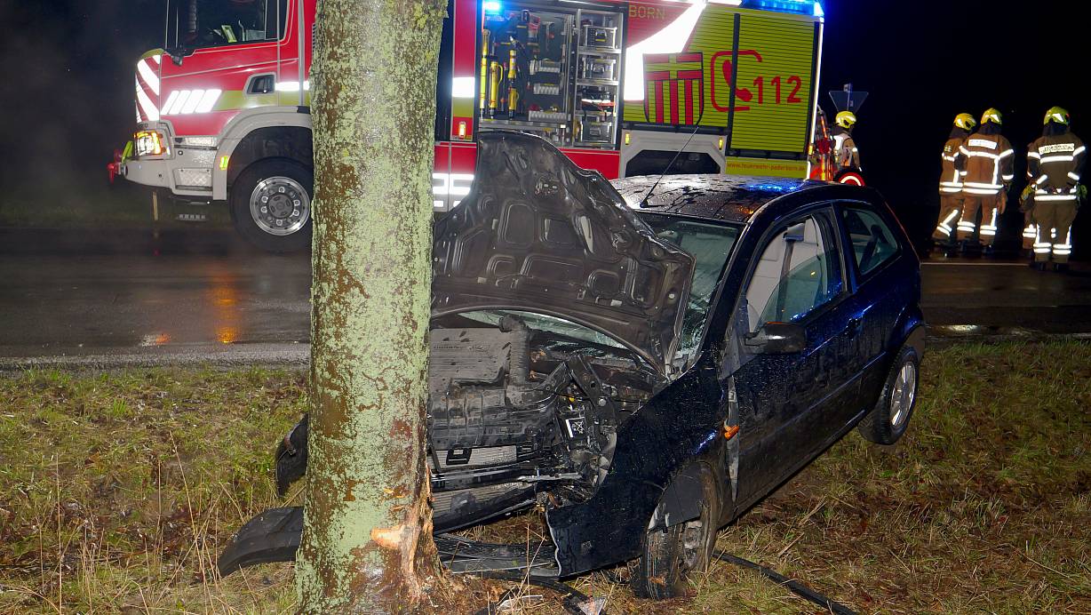 Auf der Eggestraße ins Paderborner Stadtteil Benhausen kam dieser mit fünf Personen besetzte Ford Fiesta am Donnerstagabend von der Straße ab und prallte gegen einen Baum. Alle fünf Insassen wurden dabei verletzt. | © Ralph Meyer
