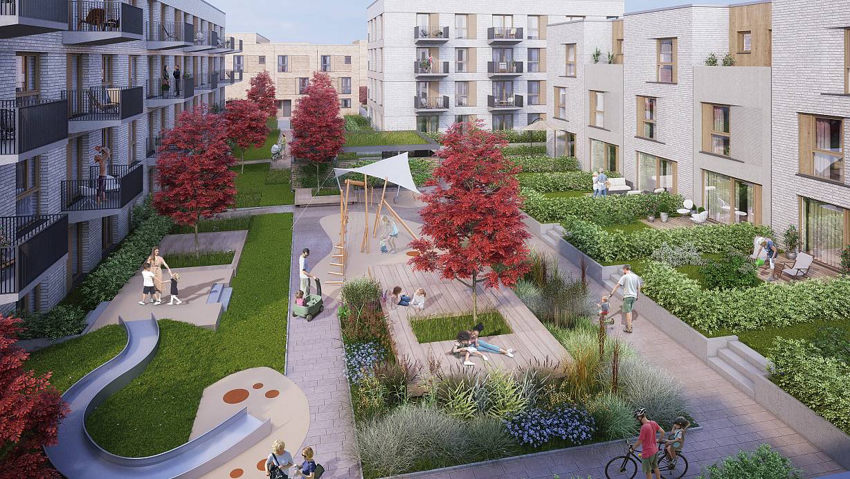 Durch die Anordnung der Reihenhäuser und der Mehrfamilienhäuser um eine gemeinsame Mitte ergebe sich „eine abwechslungsreiche Hof-Typologie“, heißt es in einer Pressemitteilung der Stadt. Dabei entstehe eine Verbindung von Wohn- und Gewerbeeinheiten mit ruhigen, gemeinschaftlich genutzten Wohnhöfen.
