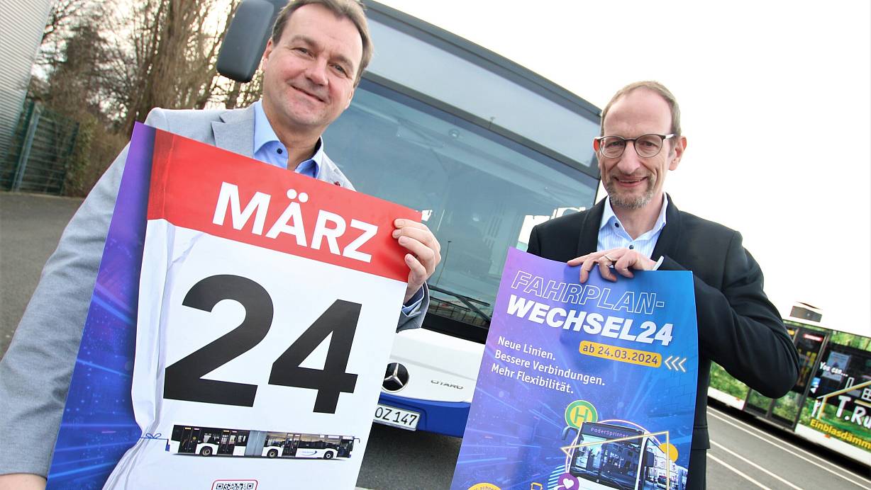 Geschäftsführer Oliver Eikenberg (l.) und René Möller, Bereichsleiter für Verkehrsleitung und -planung sowie stellvertretender Betriebsleiter, freuen sich auf die Einführung des Zukunftsnetzes am 24. März. | © Rajkumar Mukherjee