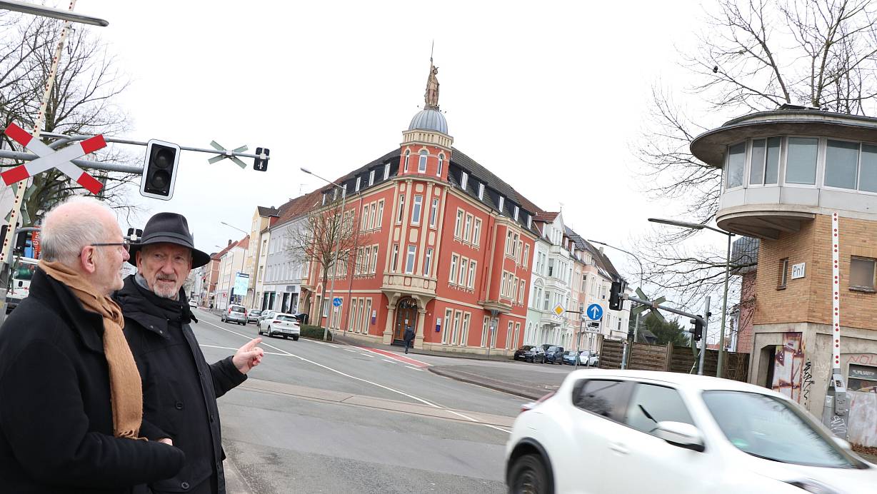 Michael Zirbel (l.) und Reinhard Drees finden das frühere Schrankenwärterhäuschen (ganz rechts) an der Detmolder Straße sehr reizvoll. | © Holger Kosbab