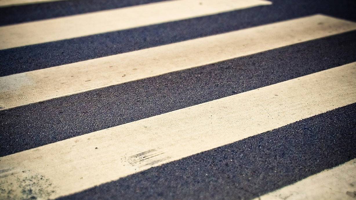 Die Fußgängerin wird auf dem Zebrastreifen von einem Auto erfasst und zu Boden geschleudert.